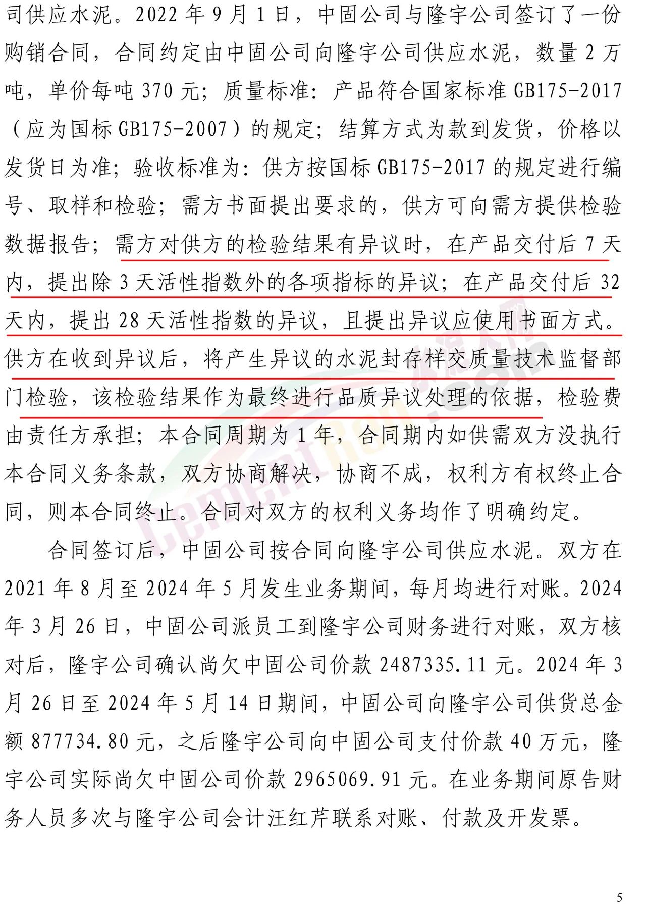 案件源于2022年9月1日雙方簽訂的一份水泥購(gòu)銷合同。合同約定中固公司向隆宇公司供應(yīng)水泥2萬(wàn)噸,單價(jià)每噸370元,質(zhì)量標(biāo)準(zhǔn)須符合國(guó)標(biāo)GB175-2007(合同原文誤寫為GB175-2017)。尤為關(guān)鍵的是,合同嚴(yán)格規(guī)定了質(zhì)量異議期:需方對(duì)供方檢驗(yàn)結(jié)果有異議時(shí),須在產(chǎn)品交付后規(guī)定時(shí)間內(nèi)以書面方式提出。供方收到異議后,應(yīng)將產(chǎn)生異議的水泥封存樣交質(zhì)量技術(shù)監(jiān)督部門檢驗(yàn),該結(jié)果作為最終處理依據(jù)。