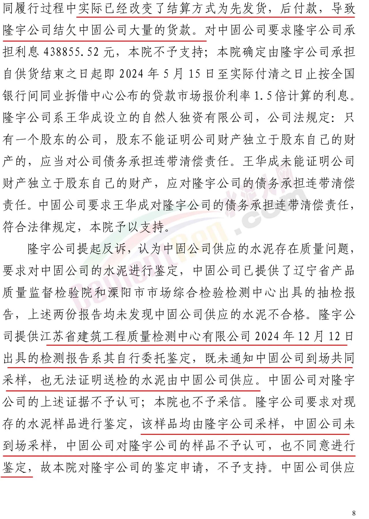 法院還駁斥了隆宇公司關(guān)于其下游混凝土質(zhì)量問題系由中固水泥造成的核心邏輯:“混凝土系由水泥、黃沙、石子、水和添加劑等各種其他材料按比例混合而成,不能僅因隆宇公司向他人供應(yīng)的混凝土存在質(zhì)量問題,就直接推定中固公司供應(yīng)的水泥存在質(zhì)量問題。”法院認(rèn)為,隆宇公司的反訴請(qǐng)求與事實(shí)不符,缺乏充分、合法、有效的證據(jù)鏈支撐。