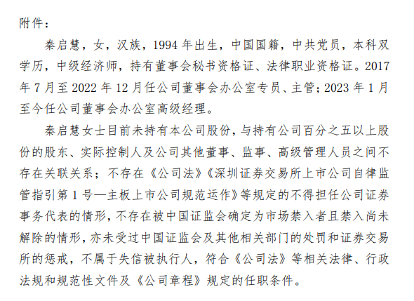 其簡歷顯示:秦啟慧,女,漢族,1994年出生,中國國籍,中共黨員,本科雙學歷,中級經(jīng)濟師,持有董事會秘書資格證、法律職業(yè)資格證。2017年7月至2022年12月任公司董事會辦公室專員、主管;2023年1月至今任公司董事會辦公室高級經(jīng)理。