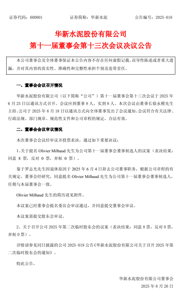6月25日,華新水泥發(fā)布公告稱,經(jīng)公司董事會會議審議并投票表決,選舉Olivier Milhaud為公司第十一屆董事會董事,任期與本屆董事會一致。根據(jù)公告,Olivier Milhaud,法國籍,1962年9月出生,巴黎埃塞克商學院碩士。